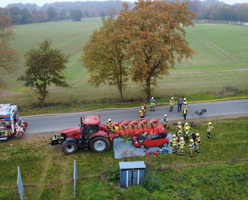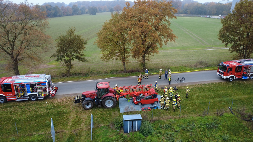 Die Firma Wernsing stellte uns dankenswerterweise ihr Biomassekraftwerk zur Verfügung. Vor Ort ging es für unsere Trupps um das Üben von Personensuche, Wasserversorgung und Riegelstellung. Zudem wurde ein Verkehrsunfall mit einem landwirtschaftlichen Gerät inszeniert und daran die technische Hilfeleistung geübt. Wie auch beim dem Brandszenario kam auch hier dann auch das DRK Essen (Oldenburg) zur medizinischen Versorgung und Unterstützung hinzu.