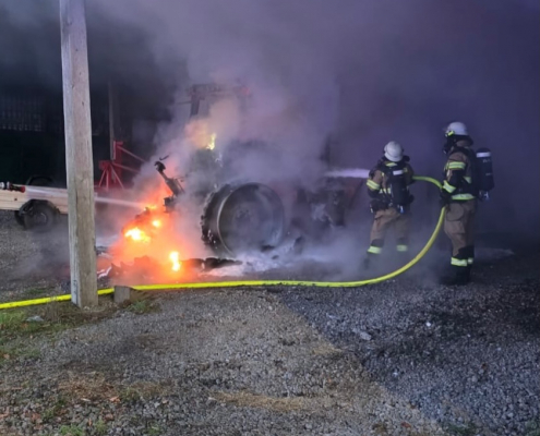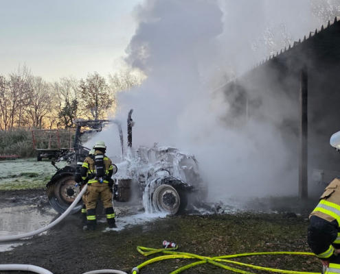 Zum Schutz der Halle und der darin befindlichen Werte wurde der Trecker zeitnah, als die Flammen weniger wurde, aus der Halle gezogen. Im Anschluss daran begannen wir mit einem Schaumangriff. Der Schaum hat eine kühlende wie auch erstickende Wirkung und sorgt so dafür, dass das Feuer nicht erneut aufflammt und erlischt.