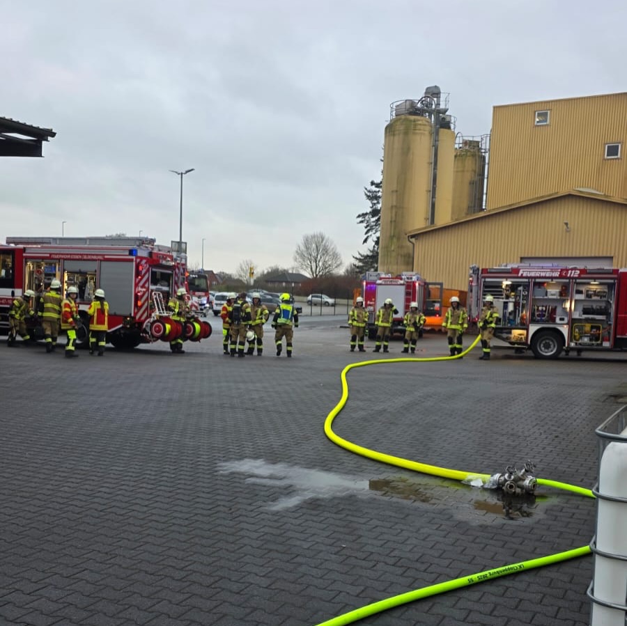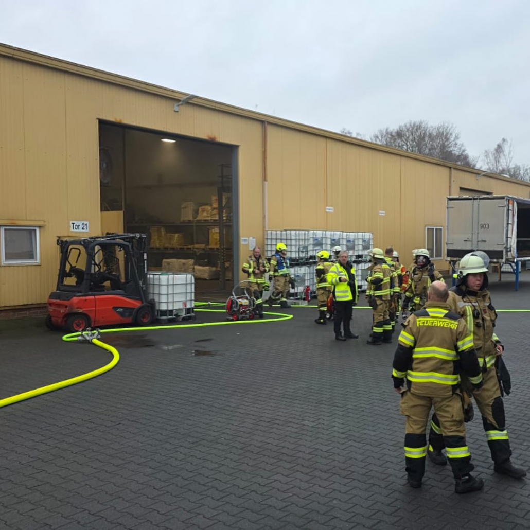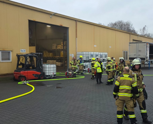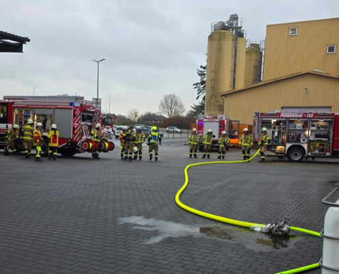 Bereits auf der Anfahrt rüsteten sich Trupps mit Atemschutz aus, damit am Einsatzort möglichst schnell gehandelt werden kann. Angekommen konnte auch eine deutliche Rauchbildung wahrgenommen werden und so wurde schnell ein Löschangriff. Die Rauchentwicklung konnte nach Erkundung auf eine Verpuffung in einer Maschine zurückgeführt werden